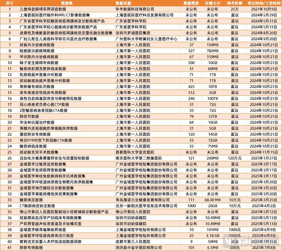 部分上架线上交易所的健康数据交易标的(统计截至2025年7月10日,非完全统计)