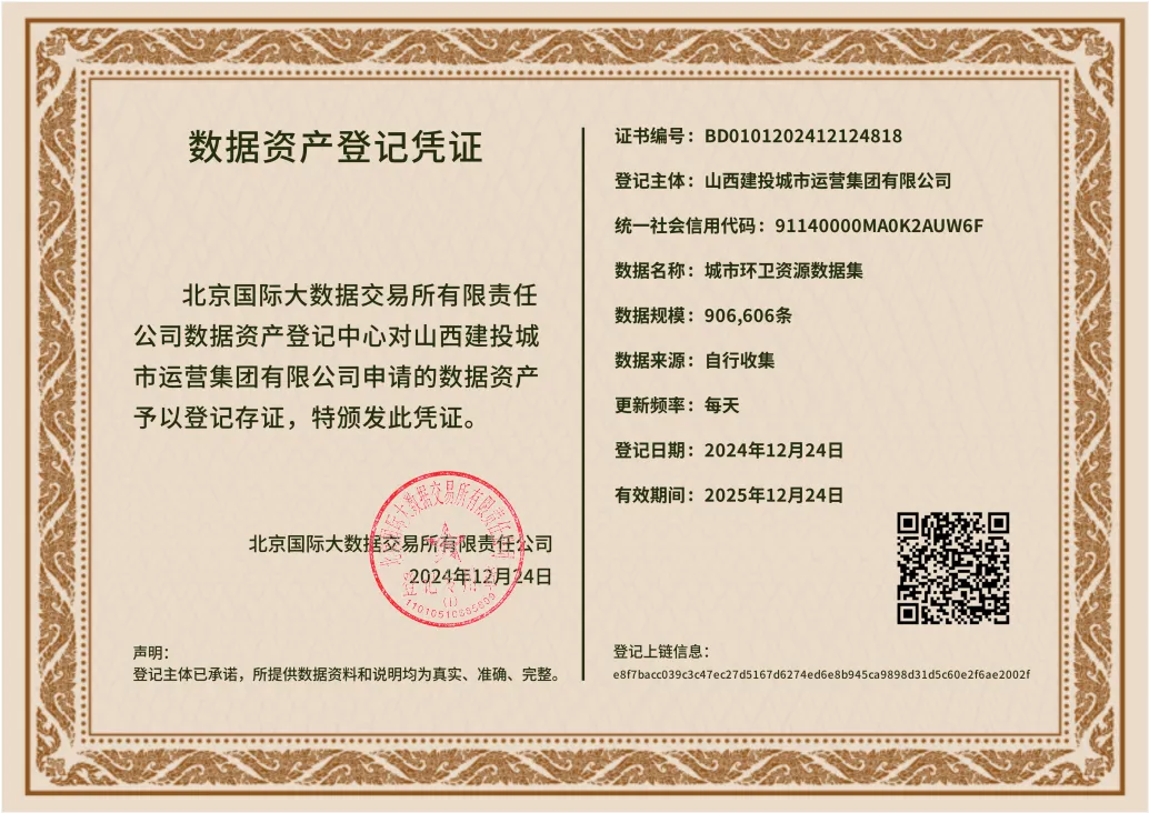 近日,山西建投城市运营集团在北京国际大数据交易所完成“城市环卫资源数据集”数据资产登记,并成功实现数据资产入表,成为全国首例城市运营数据资产入表企业。