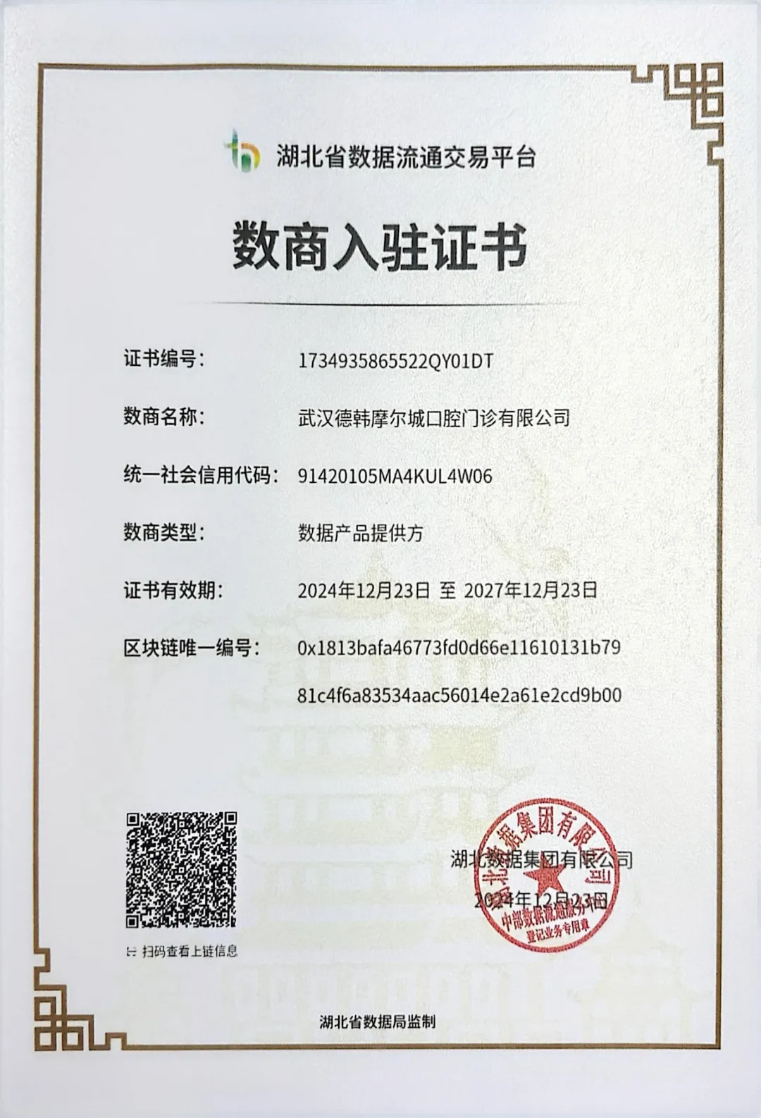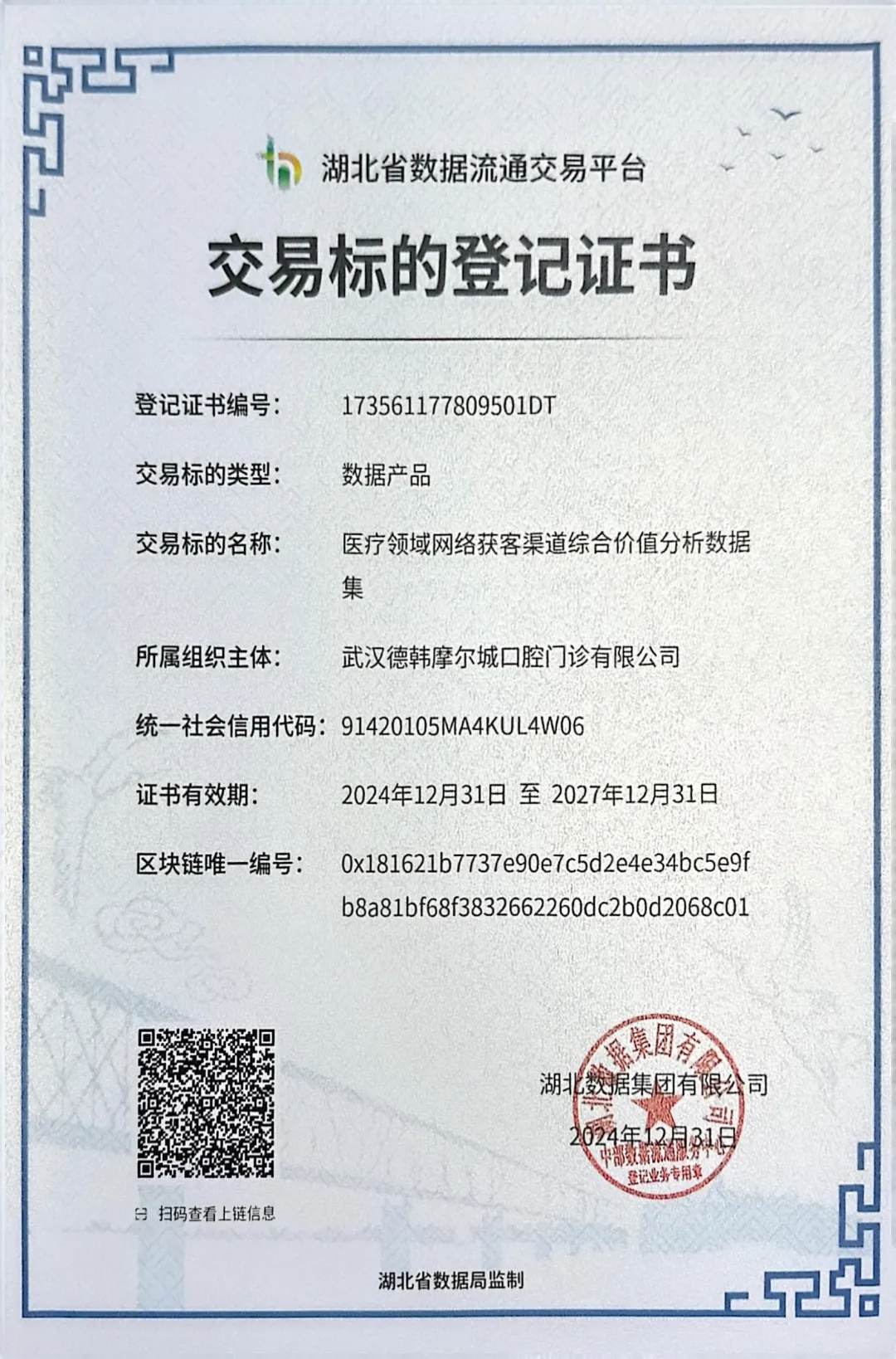 这一成果标志着德韩口腔完成了数据资产“登记+入表+上架”的完整操作。这不仅是德韩口腔公司在数据资产化管理上的一次重要突破,增强了财务透明度和市场竞争力,还为医疗行业的行业协同发展与绿色营销提供了创新示范。