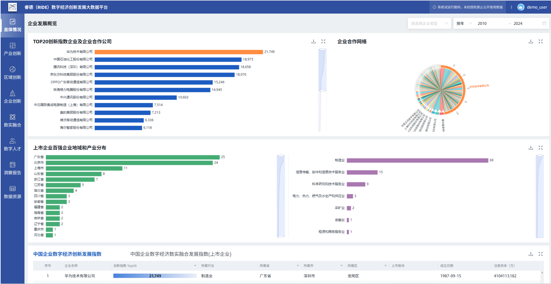 该数据集凝聚了研究团队多年的成果积累,采用人工智能和大数据技术,建立了传统专利(企业科技创新)信息与国家统计局颁布的《数字经济及其核心产业统计分类(2021)》目录中的数字经济5大类、32个中类、156个小类产业领域的精准对应关系,标注收录了2012年至2024年中国上市公司120余万条数字经济专利(产业创新)数据。该数据集接入了由广州大学数字经济创新管理研究团队研发的“睿德(RIDE)数字经济创新发展大数据平台”实现了从产业、区域、企业等多个维度,对数字经济创新发展态势进行可视化、全景式“数字扫描”,架起了洞察科技创新与产业创新融合的桥梁,可为各级党委、政府、企业、高校、个人等分析和把握不同地区、不同企业、不同产业的数字经济创新发展规模、速度、结构和态势等提供全面数据支持。