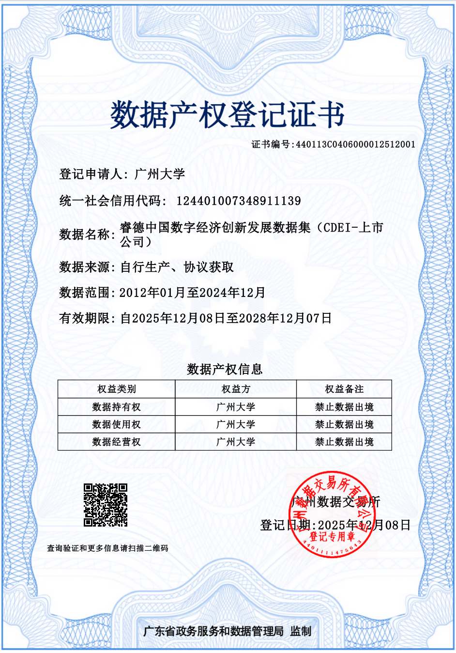 近日,由广州大学管理学院数字经济创新管理研究团队(国家工信安全中心-广州大学数字经济创新发展研究院、新华网-广州大学数字经济实验室)研发的“睿德中国数字经济创新发展数据集(CDEI-上市公司)”,在广州数据交易所成功完成数据产权登记。广州大学由此成为广东省内首个在广州数据交易所获得数据产权登记证书的高校,标志着广东高校在数据资产化与管理创新方面走在全国前列。