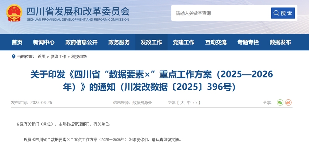 为加快数据资源开发利用,以数字化信息化赋能经济治理,更好释放数据要素价值,近日,四川省发展改革委等多部门联合印发《四川省“数据要素×”重点工作方案(2025—2026年)》。围绕工业制造、现代农业、商贸流通、交通运输、金融服务、科技创新、文化旅游、医疗健康、应急管理、气象服务、城市治理和绿色低碳12个领域,提出34条具体举措。