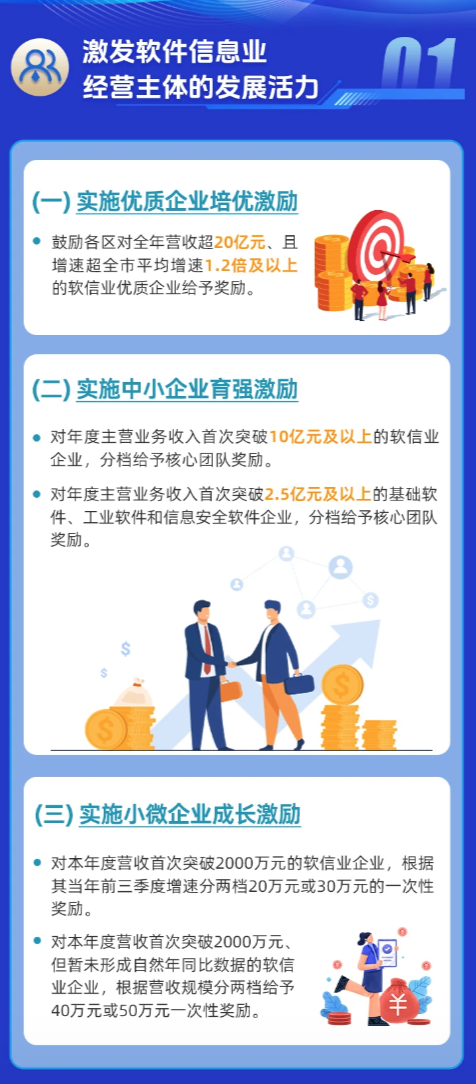 裘薇说,上海软信业企业数量超1.6万家,其中规上企业数量超3200家。《若干措施》围绕企业不同发展阶段,建立梯度式企业奖补机制,有3项具体举措:对优质企业,鼓励各区对区域内全年营收超20亿元且增速超全市平均增速1.2倍的软信业企业给予奖励;对中小企业,按营收规模分档给予企业一次性奖励,奖励标准从500万元到3000万元不等;对小微企业,按增长速度分档给予一次性奖励,奖励标准从30万元到50万元不等。