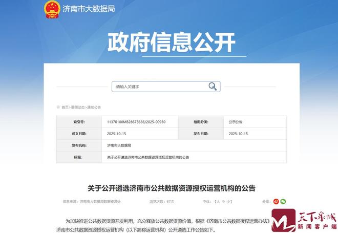 济南广电·天下泉城客户端10月17日讯10月17日,记者于济南市大数据局获悉,为加快推进公共数据资源开发利用,充分释放公共数据资源价值,济南市大数据局发布《关于公开遴选济南市公共数据资源授权运营机构的公告》(以下简称《公告》),对济南市公共数据资源授权运营机构进行公开遴选。