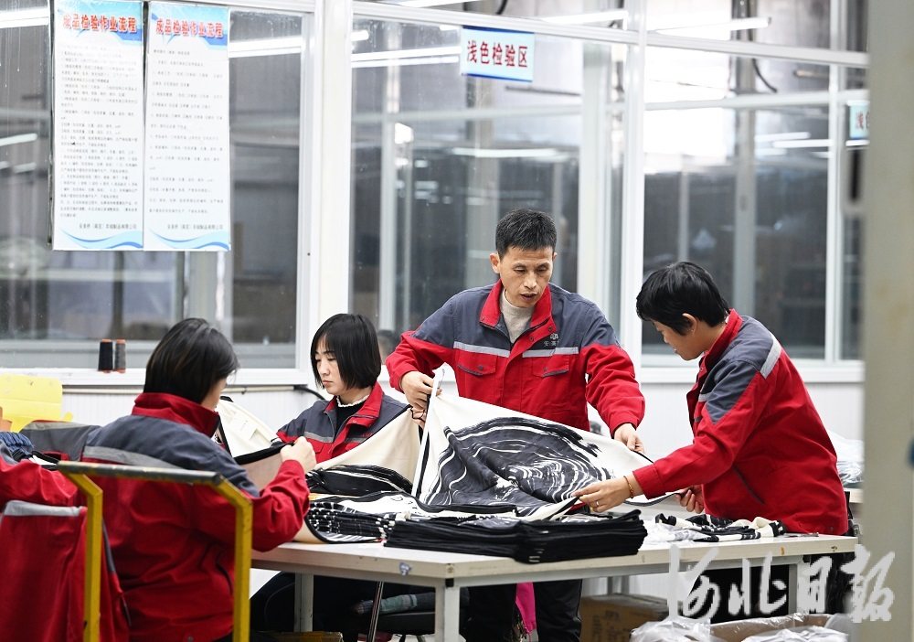 11月14日,安美桥(南宫)羊绒制品有限公司首席质量官赵建军(右二)在检查羊绒围巾质量。河北日报记者赵永辉摄